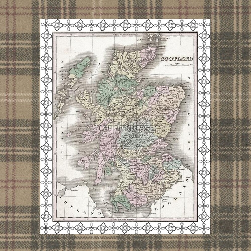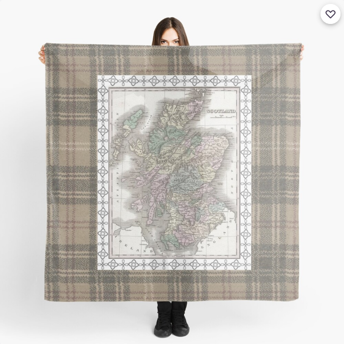 This design features an 18th century map of Scotland on a brown/gray tartan that goes with everything from blue jeans to the office and it is great in your living room too!